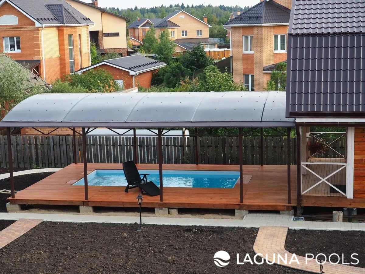 Композитный бассейн смонтирован на деревянном настиле под арочным поликарбонатным навесом.